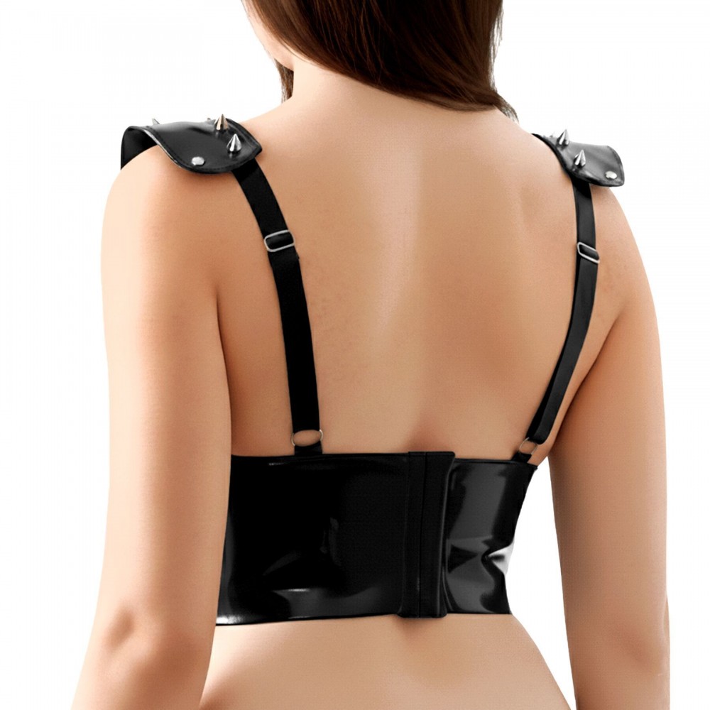 Ефектний вініловий топ Mistress створений для сміливих образів і впевненого самовираження. Глибокий V-подібний виріз підкреслює лінію декольте, а щільна посадка формує виразний силует. Декоративні металеві шипи на чашках і плечах надають моделі характеру та роблять її акцентною деталлю образу.