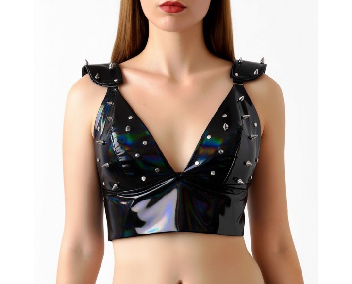 Ефектний вініловий топ Mistress створений для сміливих образів і впевненого самовираження. Глибокий V-подібний виріз підкреслює лінію декольте, а щільна посадка формує виразний силует. Декоративні металеві шипи на чашках і плечах надають моделі характеру та роблять її акцентною деталлю образу.