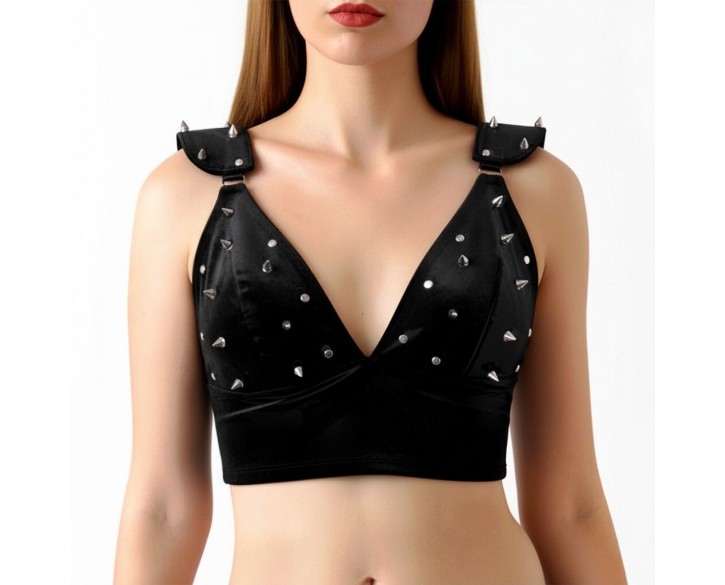 Ефектний вініловий топ Mistress створений для сміливих образів і впевненого самовираження. Глибокий V-подібний виріз підкреслює лінію декольте, а щільна посадка формує виразний силует. Декоративні металеві шипи на чашках і плечах надають моделі характеру та роблять її акцентною деталлю образу.